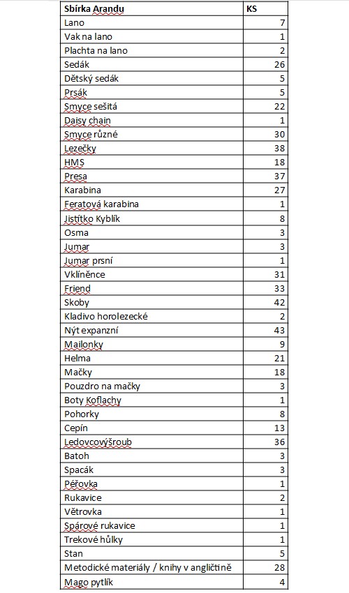 Když se mně po uveřejnění prosby, aby kamarádi horolezci darovali Aranďanům opotřebované, ale funkční součásti výzbroje a výstroje ozval Honza (Vorel), netušila jsem, co z toho vzejde. Bylo to v době, kdy vláda kvůli koronaviru zakázala i jeho festival, kam měli lidé donést svoje dary. Honza si poradil a zorganizoval místa sběru. Výsledek sbírky je skutečně neočekávaný, sešel se mně v garáži hotový horolezecký poklad. Je to důkaz, že dobrá vůle lidí má mnoho podob a díky bohu stále žije.