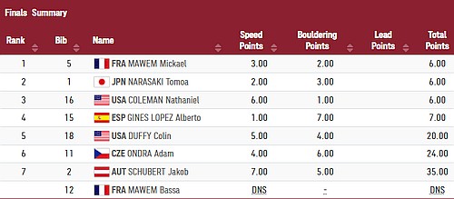 Když Jakob přelezl v tu chvíli druhého Colina Duffyho, vyhoupl se Adam na chvíli v průběžných výsledcích celkově na 1. zlatou příčku.