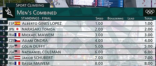 Adam Ondra skončil dnes bez olympijské medaile na 6. místě, protože na závěr ve finále lezení na obtížnost skončil 2., před tím v bouldrech 6. a v rychlosti 4. Obtížnost vyhrál Rakušan Jakob Schubert. Zlato tak v trojkombinaci sportovního lezení získal Španěl Alberto Ginés López, stříbro Američan Nathaniel Coleman a Jakob Schubert má bronz.