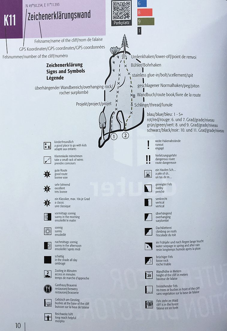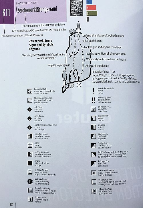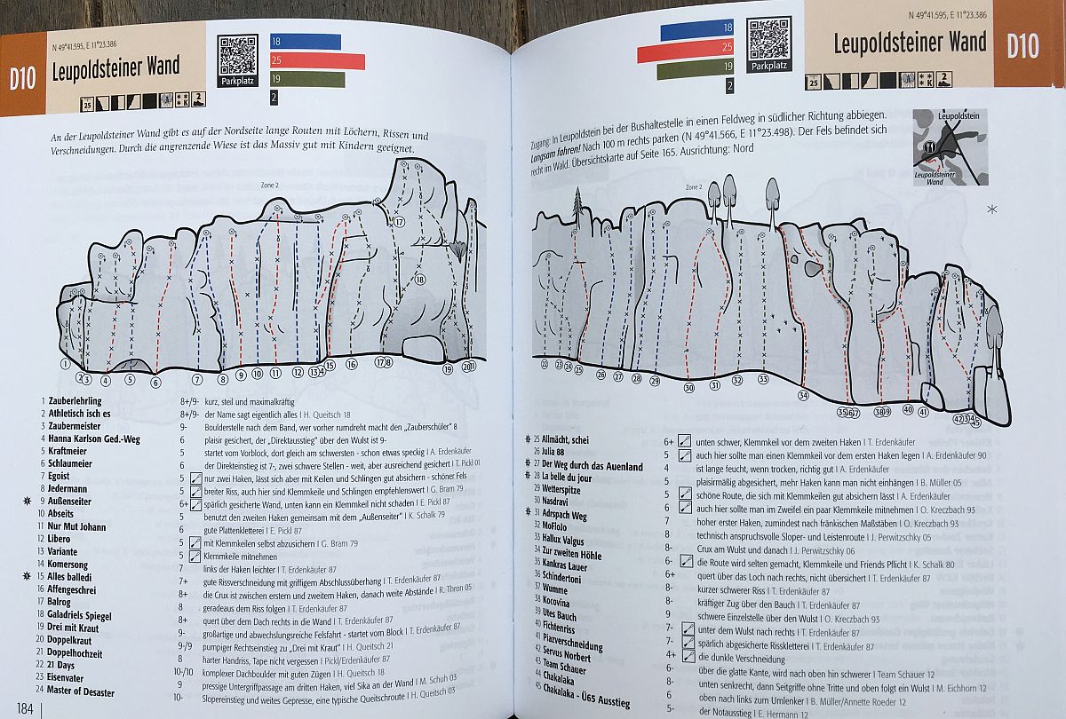 Všem souvisejícím parkovacím místům nebo výchozím bodům byly přidány jejich QR kódy. Naskenujete mobilem a hned víte kde je možné zaparkovat. Chtělo by se zajásat, už žádné bloudění ke skalám (a že jsme ho tam zažili mnoho)  avšak Schwertner v knížce uvádí ve formě QR kódu jen souřadnice parkovacích míst, pak již člověk musí další souřadnice skal naťukat nebo se držet slovního (jen v němčině) popisu. Naštěstí je vždy u každé podoblasti a stěny detailní přístupová mapka.