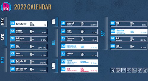Mezinárodní federace soutěžního lezení IFSC představila kalendář svěťáků v lezení na rok 2022. Na programu je 13 závodů v termínech od 1. dubna do 30. září v deseti zemích na třech světadílech.