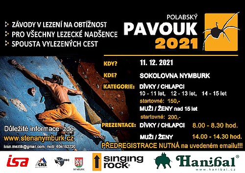 V sobotu 11. 12. se na lezecké stěně v Nymburce odehraje 11. ročník otevřených závodů v lezení na obtížnost Polabský Pavouk 2021. Přijet mohou opravdu všichni, kteří si chtějí hodně zalézt v pěkně postavených cestách a v pohodové atmosféře.