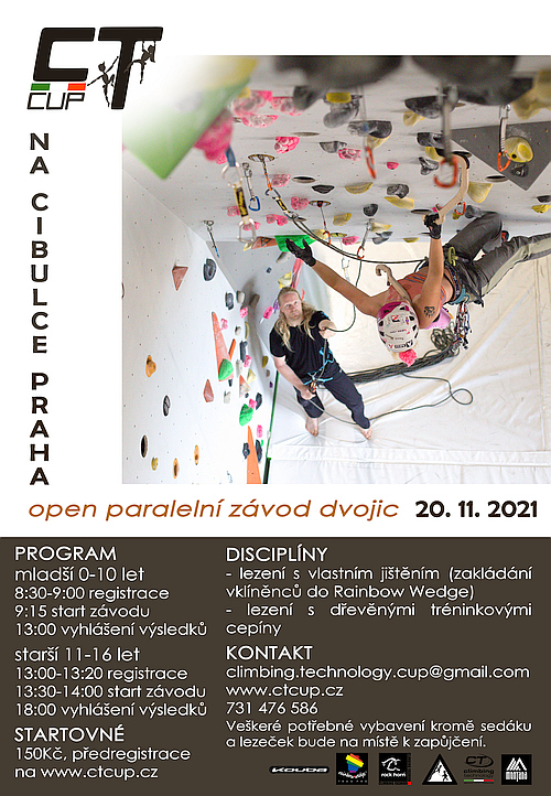 Pozvánka na CT Cup - open mládežnický paralelní závod dvojic jednak v lezení s vlastním jištěním a dále s dřevěnými tréninkovými cepíny, který se chystá v Praze na stěně Na Cibulce 20. listopadu 2021.