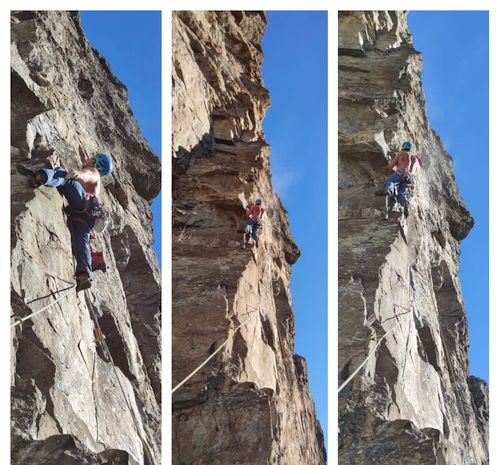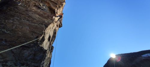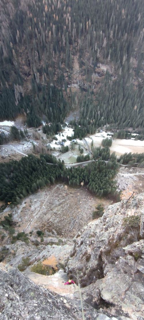 V neděli ráno -3 stupně a jdeme se pokusit o RP přelez a dočištění vybraných délek. Všechny délky nejsou vysoké obtížnosti kromě již zmiňované 8. délky, lehce převislé hrany. Mysleli jsme, že to bude okolo 8. stupně, ale hrana zaskočila svojí nečitelností a silově obtížnými pasážemi, které byly dost technicky náročné. RP dopadlo, ale moc rezerv tam nebylo 😊 Cesta vylezena tedy RP, nýty spočítané, jednotlivé délky naměřeny, cestu jsme ze slanění celou dočistili. Potom nezbývalo, než se těšit na dobré jídlo v restauraci pod masivem.