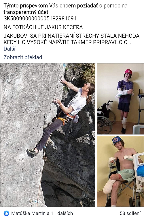 > Ahoj vsetci,moj kamarad Kuba z mojho rodneho mestecka,sportovo a akcne zijuci mal pred casem pracovny uraz,zasiahol ho pri praci silny elekritky vyboj,po ktorom mu bola amputovana noha,palec na ruke,vazne poranene obe ruky,prisiel o slachy, a celkovo stratil hybnost a cit v rukach,toto vsetko co sa tyka ruk by mu dokazala vratit operacia v zahranici za 108 tisic euro,a tym by sa mu vratil z casti jeho zivot na spravnu cestu...,za kazdy prispevok bude vdacny...