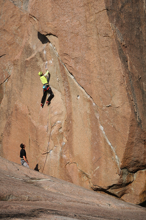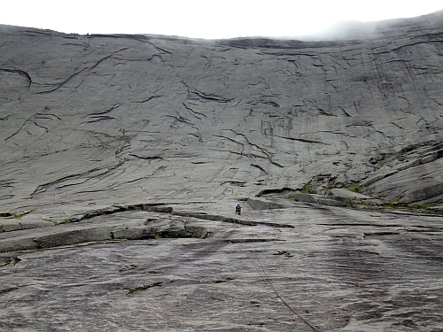 I na prváče však nakonec došlo! Povedla se nám s Vojákem skromná cesta s příznačným názvem “Out of chocolate” (6 délek, 7- UIAA, 6+ NOK) na Litlkallen. Zajímavé kličkování plotnami přechází v laškovně položený koutek yosemitského charakteru následovaný, světe div se, dvoumetrovým převískem a dolezovým rajbákem. Protokol prvovýstupu byl předán Bullerbynské vrcholové komisi ke schválení.