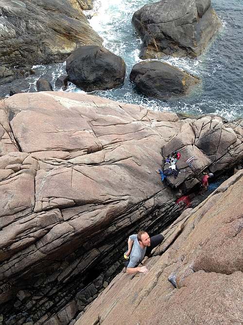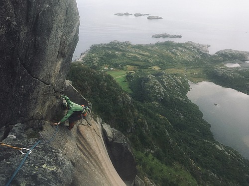 Tři zapytlené projekty bereme jako znamení a pokorně přecházíme k myšlence vylézt si tady alespoň jednu z cest již prostoupených. Volba padne na Permit to Åsgård, 18délkovou 8mínusku (7 NOK) na již zmíněný Breiflogtinden. V dolní části stěny nás čekalo lezení vyžadující technickou bravuru a ovládání fines typu patičkování za obří drn, či šplh po nestabilních čtyřmetrových hodinách. Po docela pěkných klíčových délkách v plotnách s trhlinkami a několika spity, což jsou jakési nedomrlé nýty, zjišťujeme, že to tady s tou lokální etikou nebude zas tak žhavé. Padat do spitů se nám však nechce, neboť ty jsou ruské provenience, přičemž všichni máme na paměti definici ruského žertu: jedná se v něm o to samé, jako v žertu kanadském, jen při něm někdo zemře. I přesto se Steph se Standou rozhodují z půlky cesty po spitech slaňovat. My s Vojákem se hecujeme a dolézáme dalších osm délek špatně jištěným avšak o to lezecky náročnějším rurálem až na vrchol. V 11. délce začínáme litovat, že s sebou nemáme motyčku. V 15. délce začínáme litovat, že s sebou nemáme rýč. Vrcholové výhledy však stojí za to! Je na čase začít řešit sestup. Slanění odsud by byla čirá bláhovost, ovšem momentálně jaksi nevlastníme sestupovou obuv a vlastně ani netušíme kudy dolů. Vytahujeme mobil a zadáváme do googlu přímočarý dotaz: “how to get down from Breiflogtinden”, přičemž nám vyskočí článek bratří Švihálků, kteří dle internetu vrchol sjeli před pár lety na lyžích. Když to jde v zimě na lyžích, musí to jít logicky i v létě naboso! Vyrážíme klouzáním a slézáním intuitivně směr moře a později zahýbáme do žlabu, jímž se ladně dostáváme pod nástup a dále ke stanům s marmeládou.