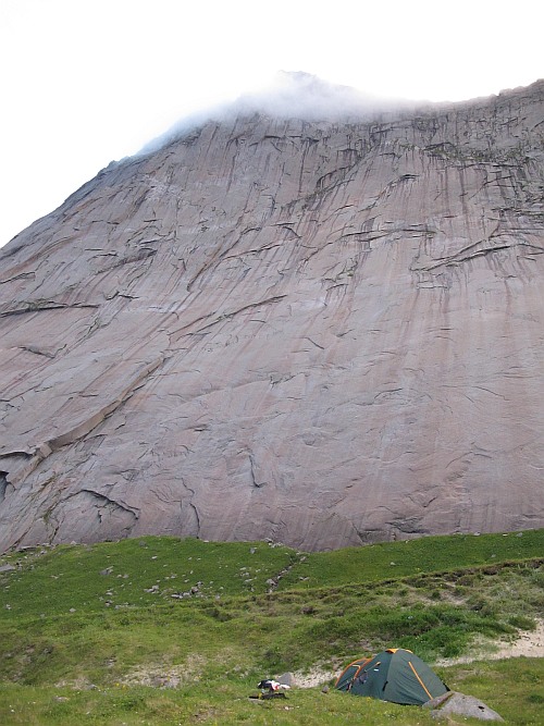 Z Reine se plavíme další den do Kirkefjordu, kde rozbíjíme tábor přímo pod majestátním Merraflestindenem, na nějž si hodláme příští den vysmahnout variantu k cestě Borr i Bekkmortna (7- A0 UIAA, 480 m). Vše máme nastudované z fotek na internetu, není tedy co řešit. Koutkem do jeskyně, z ní ladným traverzem a spárovým systémem hurá do originální cesty. Jak prosté! Z nástupové délky se však vyklubaly délky dvě, namísto roztomilého sokolíčku nás čekala špatně zajistitelná širočina, luxusní police se proměnila v odpornou klouzačku porostlou kapradím a v dolezovém koutku někdo zapomněl vypnout sprchu. Zkoušíme to tedy zleva, kde je skála suchá, ale o to příkřejší. Když obtížnost začne dosahovat stupně 9-, strategicky prchám z jedničkového mikro vklíněnce zpět do bezpečí pofiderního štandu a hurá dolů.