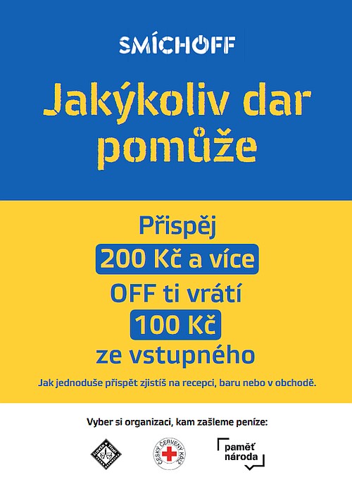 Přispěj na recepci OFFu alespoň 200 Kč na sbírku dle tvého výběru a OFF ti vrátí 100 Kč ze vstupného ten den.