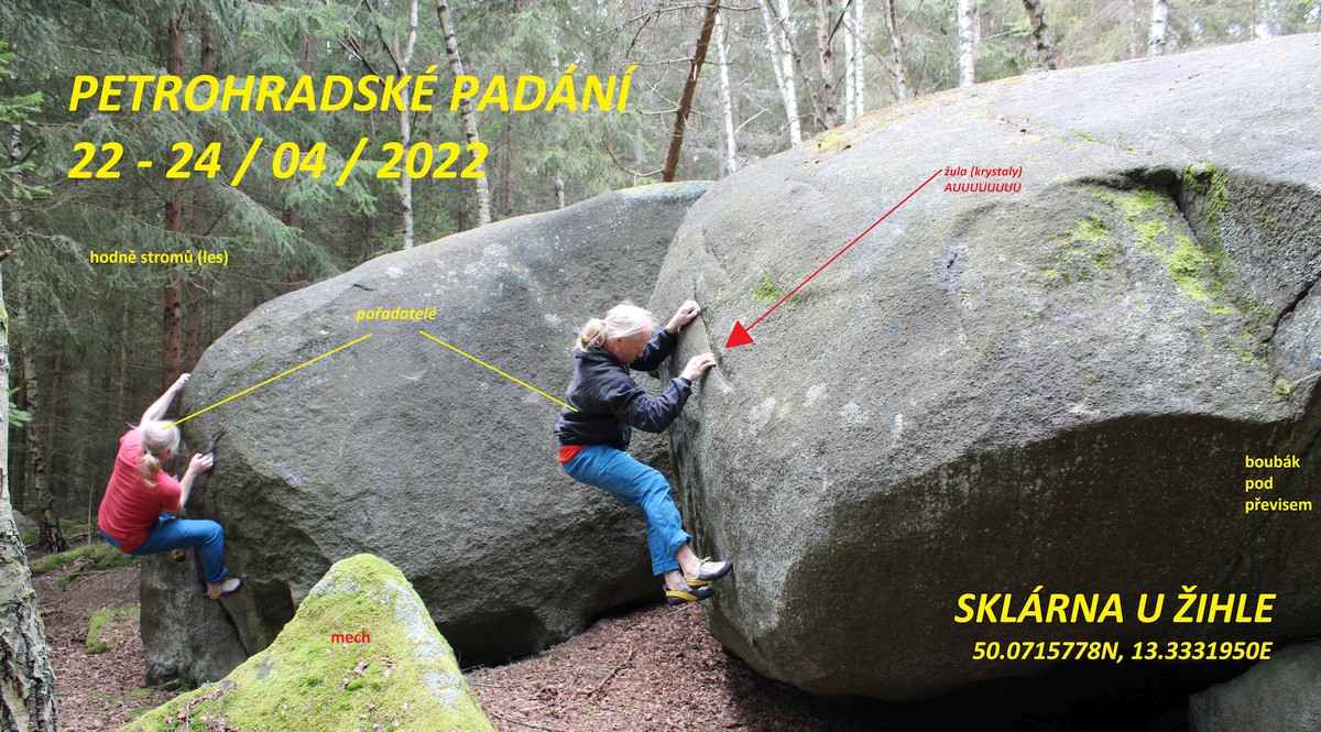 Sranda soutěž v boulderingu na přírodních kamenech. Různé kategorie, různé charaktery lezení, obtížnosti od 1 do 8B+ Fb.