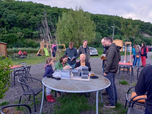 Křest nového průvodce na Český kras - autoři Jirka Sika a Petr Resch u stolu s knihami (foto Ivo Semrád)