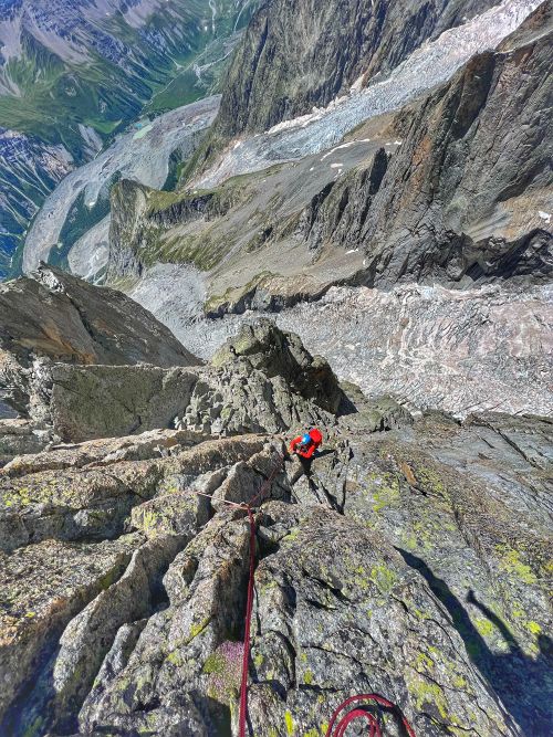 9:15 - BIFIDA. Zda to dnes stíháme na bivacco Cravery nebo sotva na vrchol Aig. Noire si netroufáme odhadnout. Lezení je hezké, počasí krásné. Těla po 4 hodinách na skále, zahřátá!