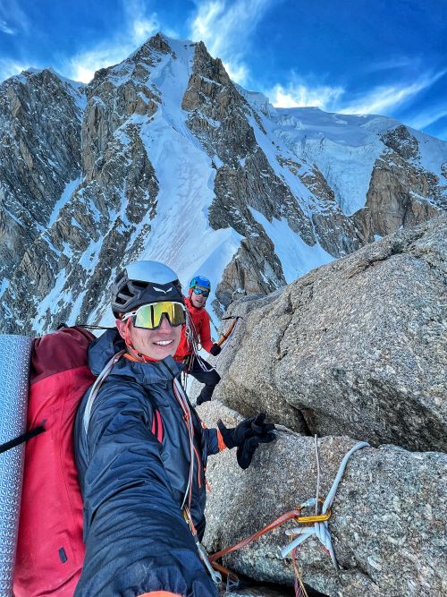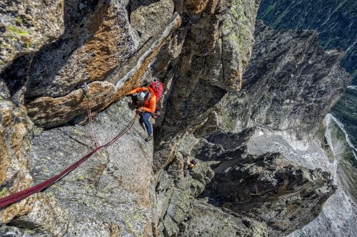 16:00 - Klíčová délka - Ondra leze krásně na ,,prvo”. Já se snažím ,,přežít” na druhém konci lana :) Na zádech cepíny, mačky, spaní, jídlo a oblečení pro přežití na hřebeni. Prolezená bříška prstů. V lezečkách černé nehty z MČR v ultra. V hlavě písnička od Hanibalu s frází o čistotě stylu… ze štandu odlézám za pomoci friendu…