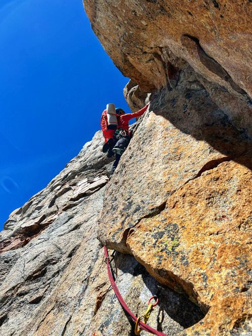 5:00 - První bloudění - vytahujeme lano… Jdeme souběžně. 55 délek jen na vrchol Noire… Jištění všech délek přes štandy? Vyloučeno!