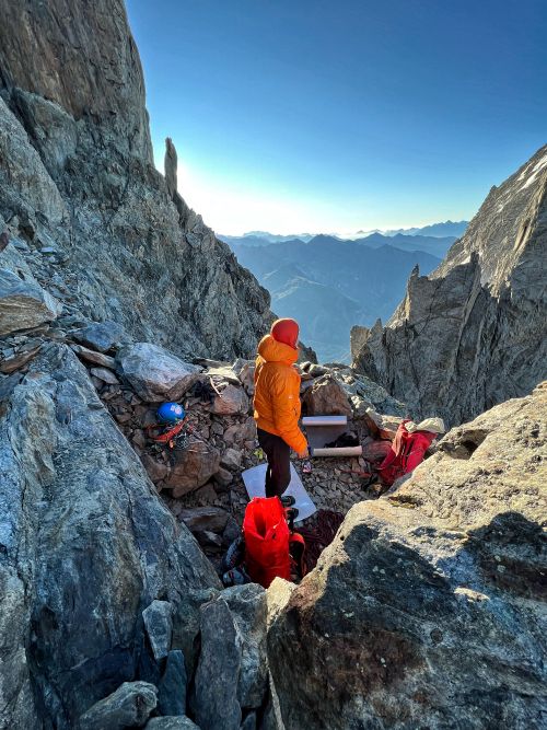 19:00 -  BICH. Chodidla v lezečkách jako v okovech - ruce z lezení ,,pryč” - STÁLE NENÍ KONEC. Na sestupu z Bich-u využíváme erární lana. Není čas zjišťovat ,,výrobce a rok”. Traverzujeme na vrchol Noire, zase je to dále než se zdá… Vyzouváme lezečky, po 10 hodinách. Zhruba takový čas jsem v nich strávil za celý letošní rok…