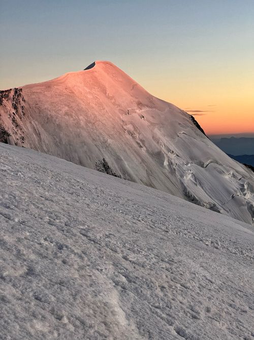 20:15 - Aiguille NOIRE. Pohled na vzdálenost k vrcholu Mont Blancu a zejména 400 metrů obávaného slanění malinko potlačuje vrcholovou radost. Sníh znamenající vodu, zde není. Nemáme na výběr.