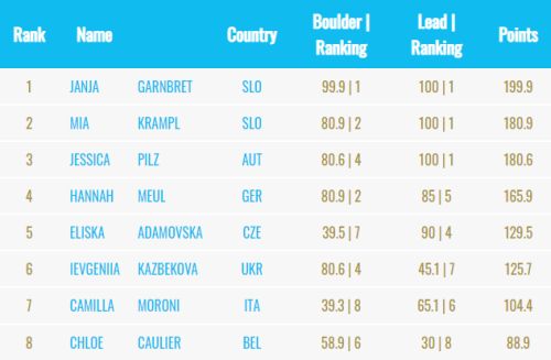 Eliška Adamovská dnes na Mistrovství Evropy v Mnichově ve finále lezecké kombinace - obtížnosti a bouldrů - vybojovala 5. místo. Vyhrála Slovinka Janja Garnbret.