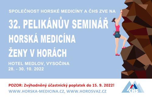 Třicátý druhý ročník Pelikánova semináře se uskuteční na Vysočině v hotelu Medlov ve dnech 28.-30. října 2022. Náplní Pelikánova semináře je horská medicína, bezpečnost a metodika různorodého pohybu v přírodě s důrazem na horské prostředí ve všech jeho podobách od velehor, přes Alpy až po vrchovinu. Letošním hlavním tématem budou Ženy v horách.