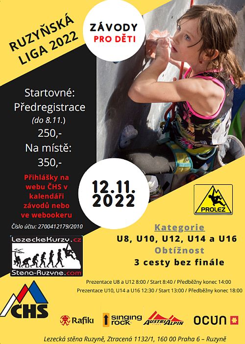 V sobotu 12.11. se uskuteční v Praze na Ruzyni závod pro děti. Závod se koná pod ČHS – 3.liga. Závodí se v lezení na obtížnost (3 cesty bez finále). Kategorie U8, U10, U12, U14 a U16.