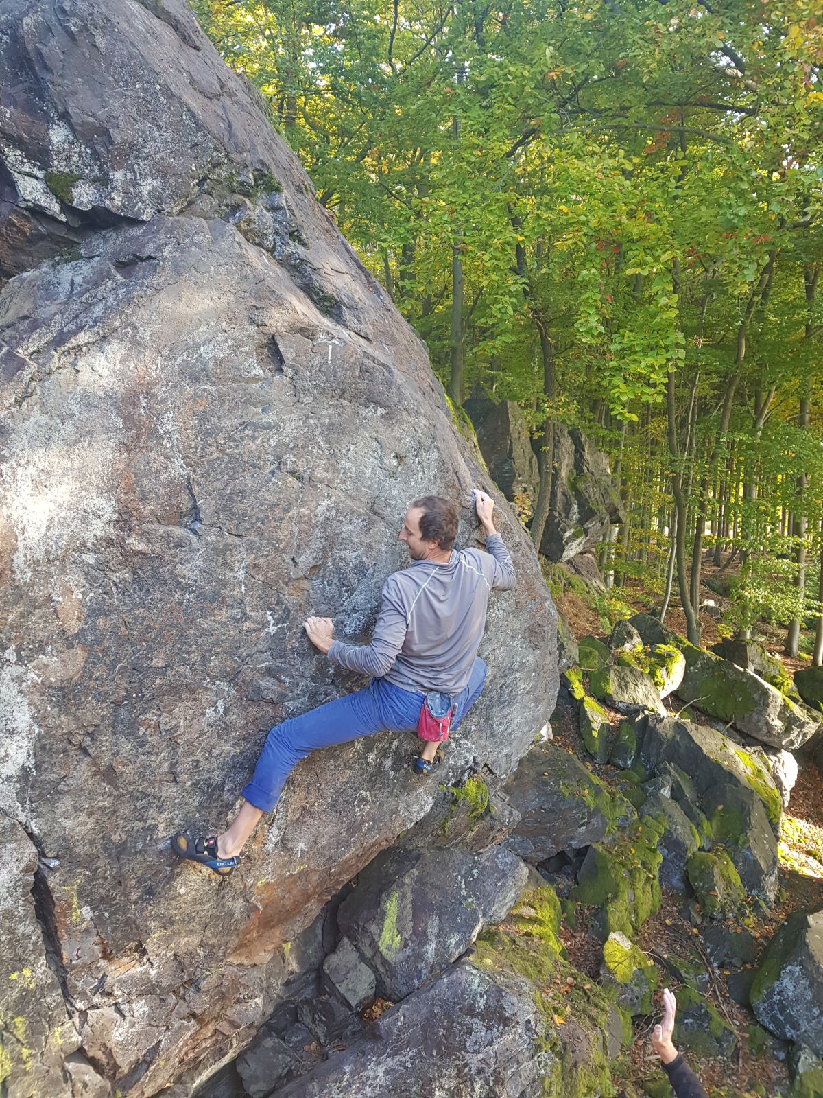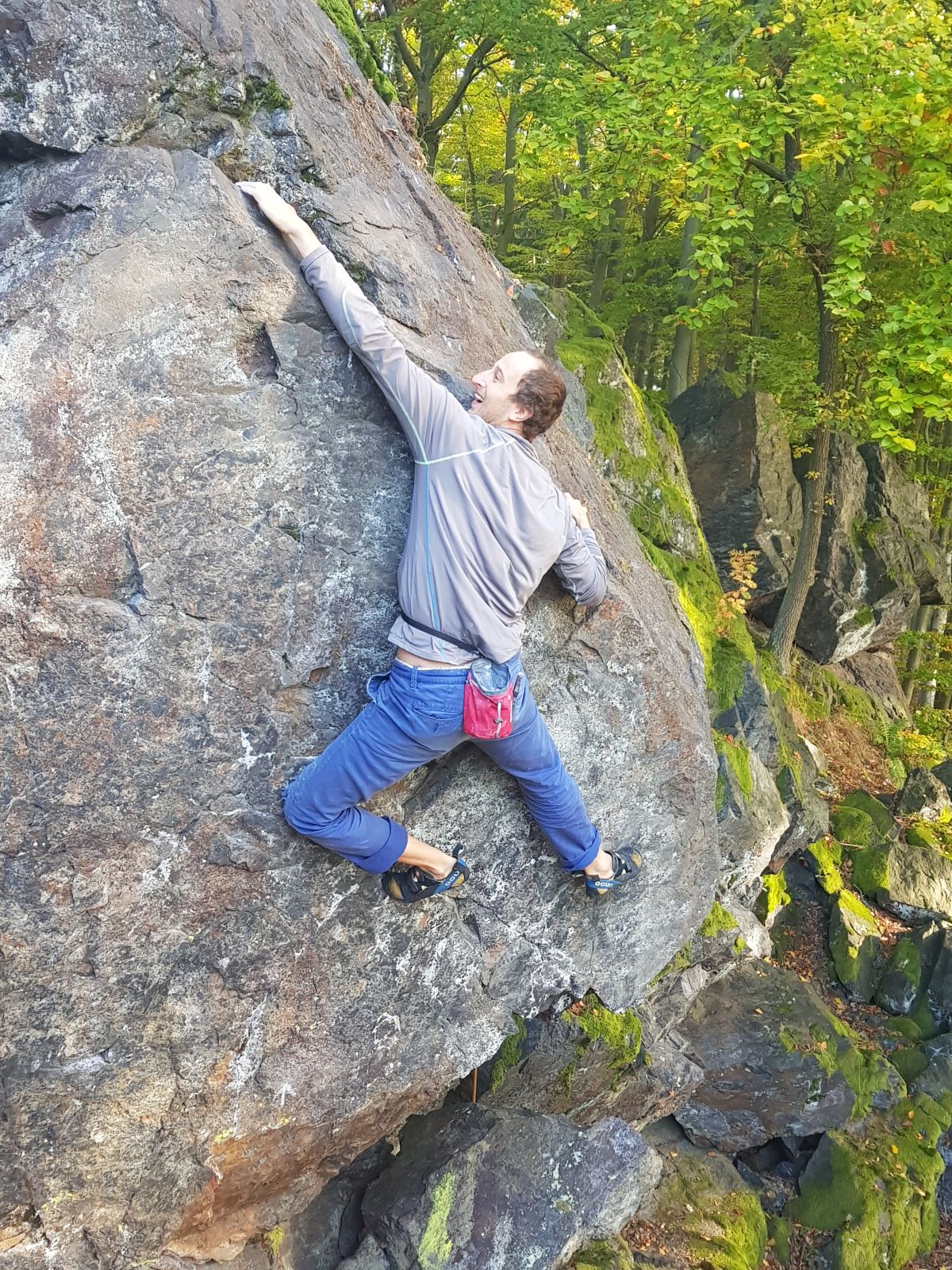 Vojtovi na pámatku, udělali jsme boulder Pohrobek, SD 6C. Jak monolit obelisku ční na Dehetníku skalisko Klofan, kde tato přímá, osm metrů vysoká linie vábí k přelezu.