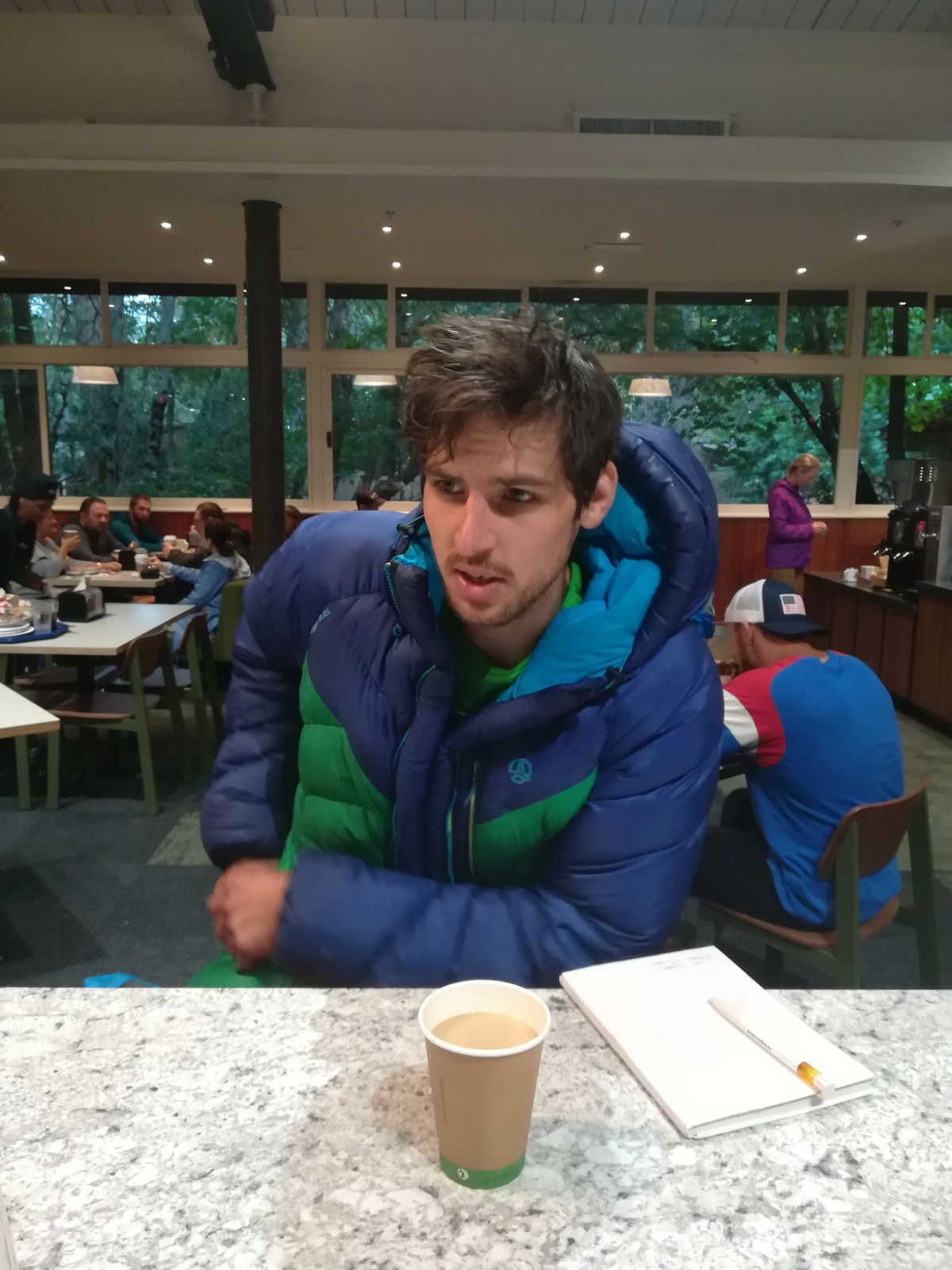 Vojta při psaní deníku u kávy v Yosemity lodge