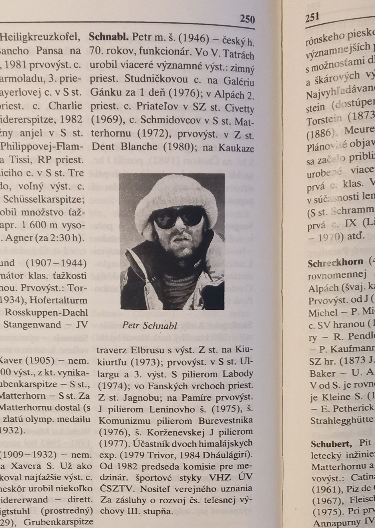 Heslo Petr Schnabl v horolezecké encyklopedii od Ivana Diešky a spol. z roku 1989: