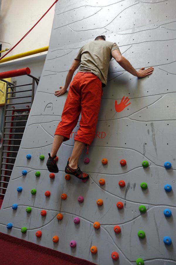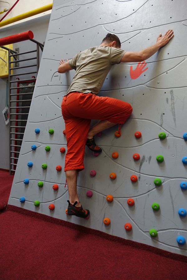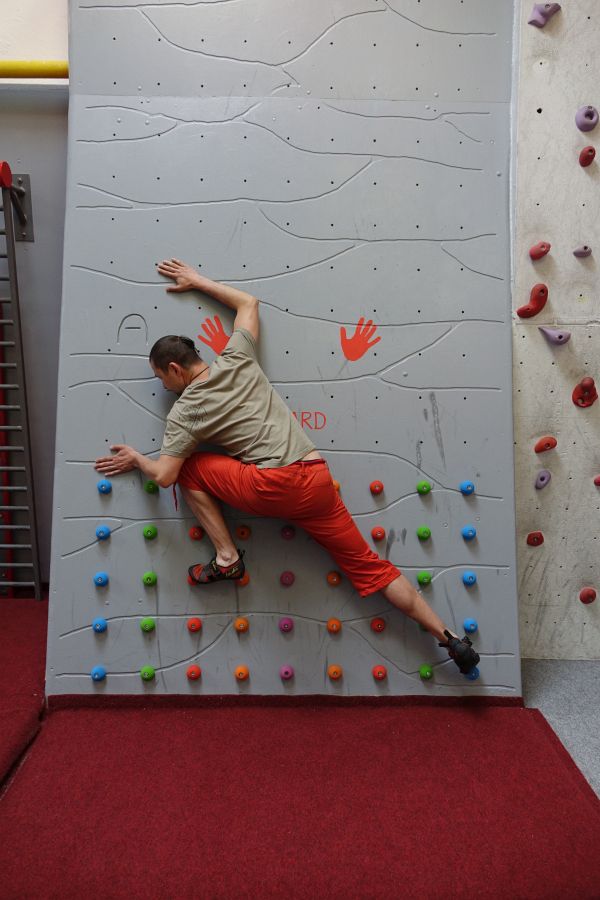 Tady na fotkách na stěně máme použity jen stejné chyty a barevné rozlišení a to z toho důvodu, aby se dalo cvičit symetricky. Nemyslete si, že když jeden pohyb uděláte doprava, že ten samý uděláte i doleva.
