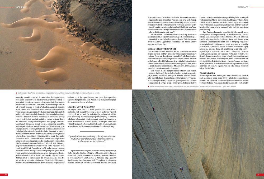 Trochu dál, na africký kontinent zavítáš s francouzským dobrodruhem a fotografem Jean-Marc Portem, který ti odhalí krásy lezení velkých stěn v Mauritánii. Tentýž Jean-Marc Porte se ti pak představí také v letošním prvním portfoliu souborem fotografií nazvaném „Lords of Balhoro“.