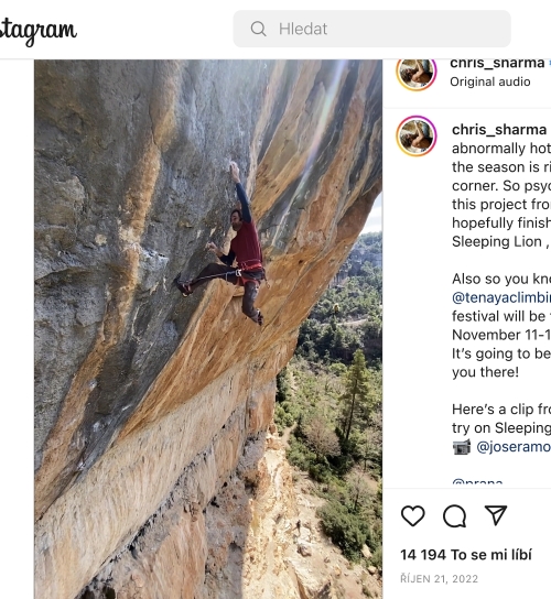Chris Sharma se znovu přihlásil o slovo. podařilo se mu přelézt novou cestu, kterou nazval Sleeping Lion 9b+. cesta se nachází v jeho oblíbené v Siuraně a Chris cestu zkoušel zhruba rok a půl.