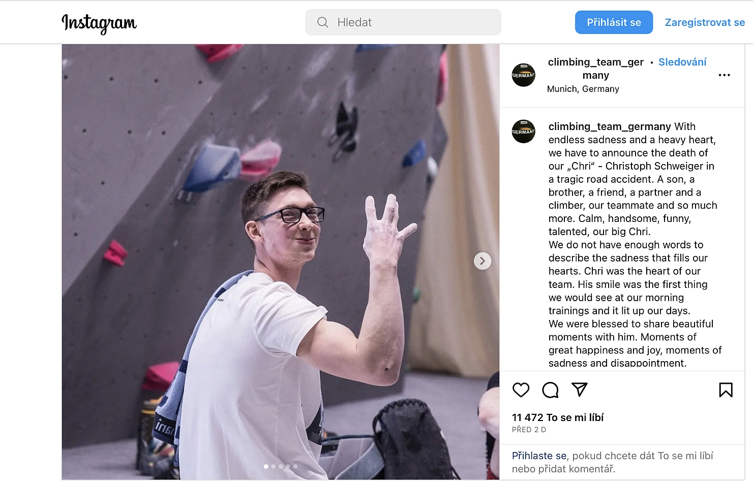 Christoph Schweiger (21let) byl současný talentovaný německý lezcec, který zemřel poté, co ho v sobotu 8. dubna srazilo auto v Arcu.