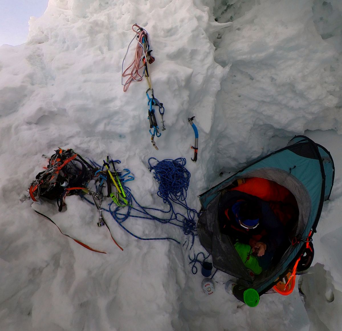 Klíčový den celého výstupu. Nevěděli jsme sice, zda dokážeme prolézt následující skalní metry, ale bylo nabíledni, že pokud se to nepovede, máme velký problém. Dostat se nazpět místy, přes která jsme dva dny lezli, bylo jen těžko představitelné. Na druhou stranu osmdesátimetrový skalní úsek nad hlavou, připomínal jeden velký převis. Vnitřní hlas mi našeptává pokaždé, když nevím a obavy jen rostou: "Dej soustředěný platný pokus a uvidíš." Trvalo mi dlouhé hodiny, než dvě délky hrabání v kamenolomu byly pod mýma nohama. Zející propast dolů na úpatí ledovce měla již dobrý kilometr. Strach zmizel. Nebyl již na něj prostor. Dostavil se jen pocit svalové únavy, v hlavě alarmoval bzučák, že psychika též mele z posledního. Tělo se začalo třást z podchlazení a z nebe začalo sněžit. Zpropadená skála je za námi a cesta k vrcholu je otevřená. V této chvíli nastoupil Matěj, který se s přesnou rutinou pustil do dalších už dvou ledových délek. Na konci té druhé našel svahovou trhlinu, kterou jsem měl vyhlédnutou již od nástupu. Myslel jsem si, že by tam mohlo být místo pro bivak. Také že jo, v sedmdesátistupňovém svahu další polibek od tohoto světa. Stavíme stan, vaříme vodu pro naše ztuhlé a sušené vnitřnosti. Leháme na kutě, které proti předchozímu večeru se zdá býti i s nebesy.