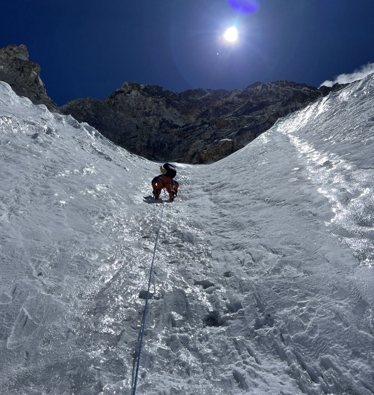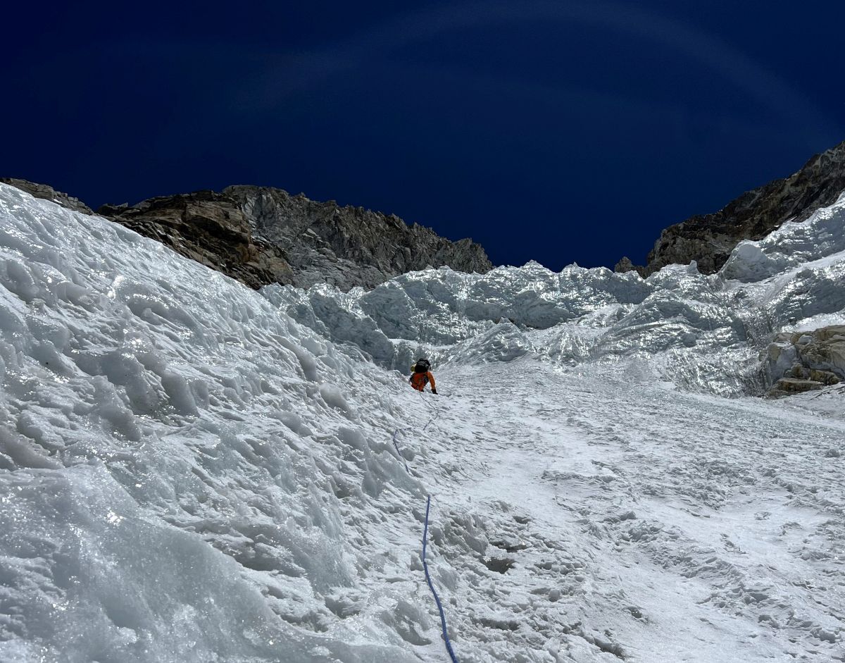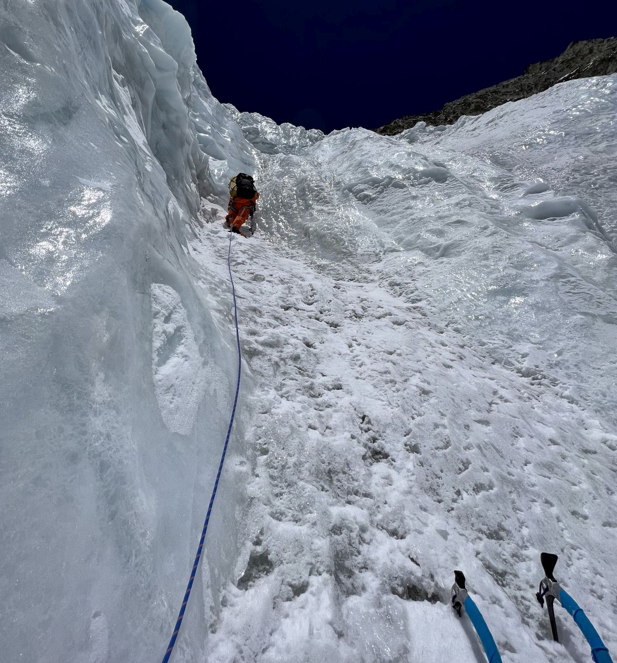 Lezení prvního úseku odpovídalo předpokladu. Nikterak jsme se mezi sebou v počátcích nejistili, jen lano dělalo tiché spojení našich osudů. Nabírali jsem rychle s každou hodinou výšku. Kolem desáté se do nás konečně opřely sluneční paprsky. Nebyly agresivní, ale dostatečné na to, aby z nás ranní zamražení pozvolna odcházelo. Lehce po poledním dolézáme pod nejkolmější část ledové skluzavky, který přetínal sérakový práh. Svah dosahoval 80° a jen občas se zvedal v kolmý modrý led. Námaha rostla, postup se zpomalil a odpolední slunce rychle putovalo k západu. V zátylku i ramenou je znát únava z neustálého hledění vzhůru a mlácení cepíny. Plíce zatím stíhají, ale za pauzu by jistě též hlasovaly. Při jednom šikmém traverzu, přes systém žlábků, který navazoval na další směr výstupu, jsem náhodou narazil na jeskyňku. Ta vznikla před nějakou dobou, kdy v jedné části se  ledový krunýř pohnul směrem dolů a vnikla tak porucha s metrovým odtrhem. Jůůů…, pro nás se jednalo o místo pro bivak, kousek nad šesti tisíci metry, které seslalo samo nebe.