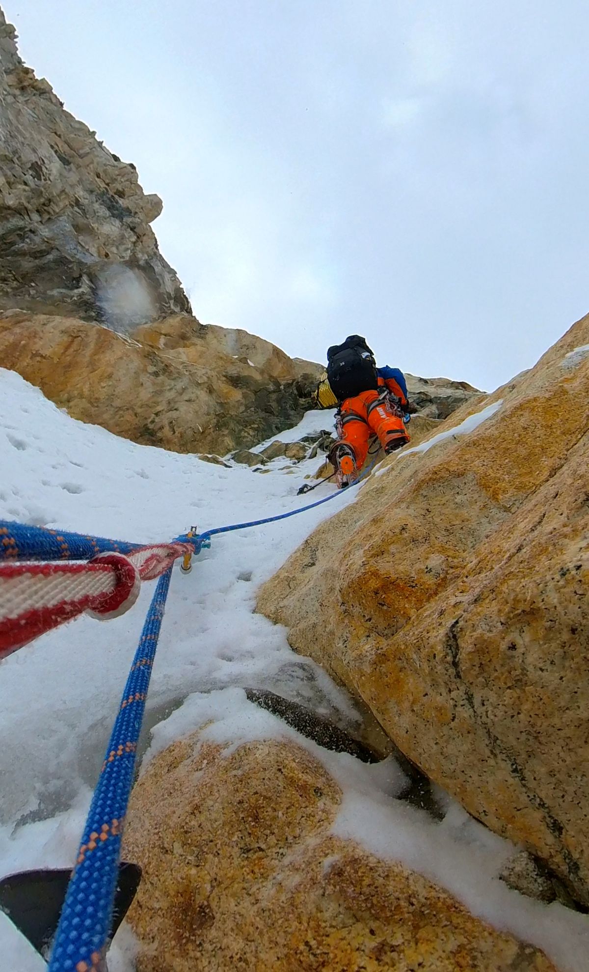 Jestli nás do té doby počasí moc netrápilo větrem a sněžením, tak dnes bez pozvánky přišla změna. Ráno se na nás smálo slunce a po chvíli radosti nadvládu přebraly mraky.  Z bivaku jsme prolezli  dalších 150 metrů ledových varhánků, až do místa, kde z nich vyrůstala souvislá skalní bariéra. Tam nastal již předvídatelný průšvih. Hned první metry ukázaly, že skála je jak perník. K tomu posypaná nedržícím sněhem. Začal tanec na mačkách a máchání cepíny, které jen stěží hledaly oporu na konci svých hrotů. Připomnělo mi to kreslenou postavičku Mickey Mouse, jak nad propastí roztočil nohy a ruce a chvíli vypadalo, že se nikdy nezřítí. Ulezl jsem v tomto hnojníku, po velkém vypětí, jen dvě délky, čítající sedmdesát metrů. Veškeré jištění mělo spíš psychologický efekt, než že by se dalo na něj spolehnout. Když jsem Matěje dobíral, tak dvakrát s něčím vypadnul. Naštěstí místo které jsem založil na štandu, vydrželo a tak naše těla neputovala vstříc údolí. Věděl jsem, že ani o metr se dál již nehneme. Počasí též dalo jasně na srozuměnou, abychom rychle vyhledali místo na přespání. Z vršku začaly sjíždět sněhové vodopády a vítr se zahryzával přes oblečení až na kost. Nicméně v dohledu žádná plošina, kam by se mohla posadit aspoň jedna zadnice. Vše bylo nepřátelsky šikmé. Nezbylo, než začít kopat do ledové stráně, která měla sklon 70°. I tam po dvaceti minutách mlácení, jako hluchý do vrat, se vítězství nekonalo. Pod pár centimetry ledu zela skála se stejným sklonem. Jsme v řiti a to s celým cirkusem. Co dál, bylo jasné. V jištění, na kterém jsme zavěšeni, bylo třeba uchytit vrchlík stanu. Později to evokuje velký pytel odpadků, zavěšený na hřebíku. Do něj se musíme nějak vtěsnat i se spacáky a vším tím bordelem tak, aby nic nespadlo. Ve stanu se o nic nedá opřít, takže naše ostatky kloužou po kluzkém podkladu. Jsme dvě marionety chycené za flígr uprostřed nehostinné stěny. Noc plná vášní, která se jen tak něčemu nevyrovná, vzala víc než dost z tenčících se sil.