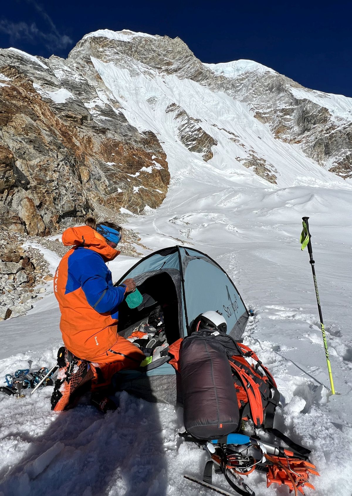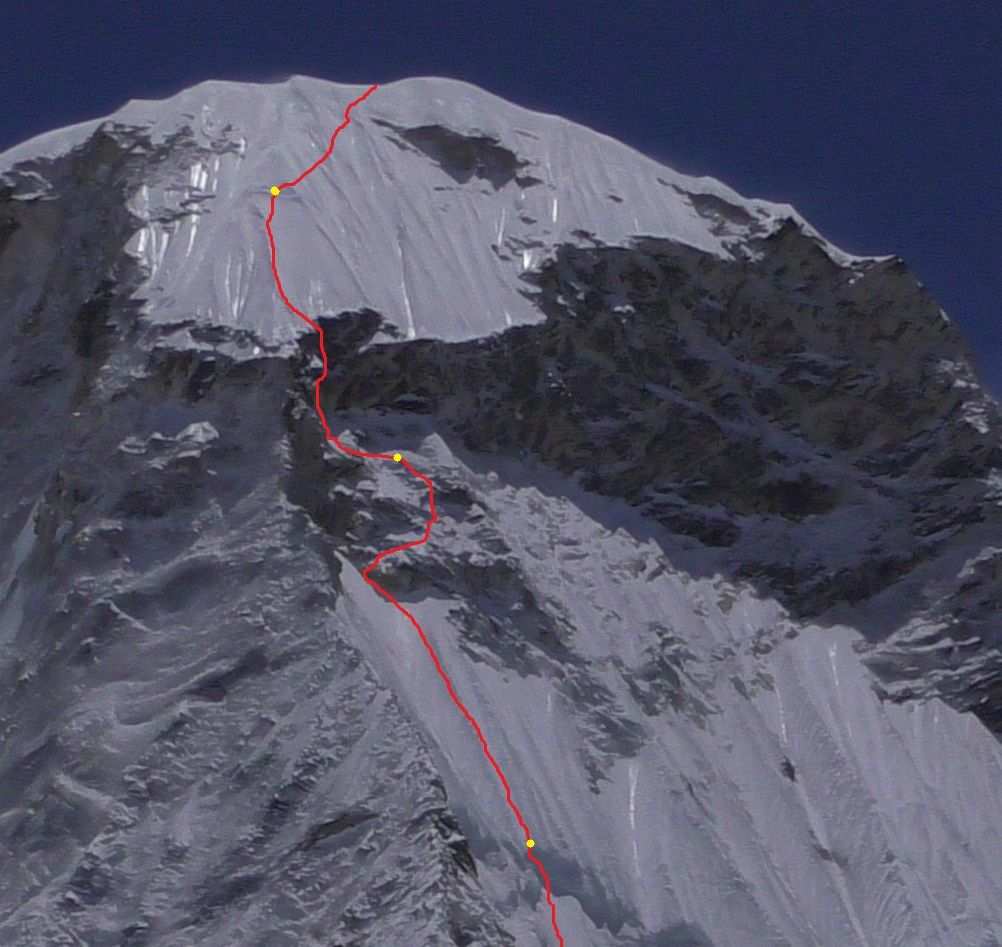 Naše ležení se nacházelo přímo pod stěnou na ledovci v 5500 metrech. Pohodové místo na spaní, krom pohledu nad nás. Tam se od úpatí napřimoval ledový svah, který v dolní části mohl mít 50°. S dalšími metry se napřimoval a v horní části přecházel do kolmého prahu, kde se vysmíval rozeklaný ledovcový sérak. Nad ním se zvedala na pohled temně převislá a neprostupná skalní zeď. Dobrou noc a klidný spánek. Hlavně žádné blechy, ani černé můry přicházející z představ, co nás ráno čeká…