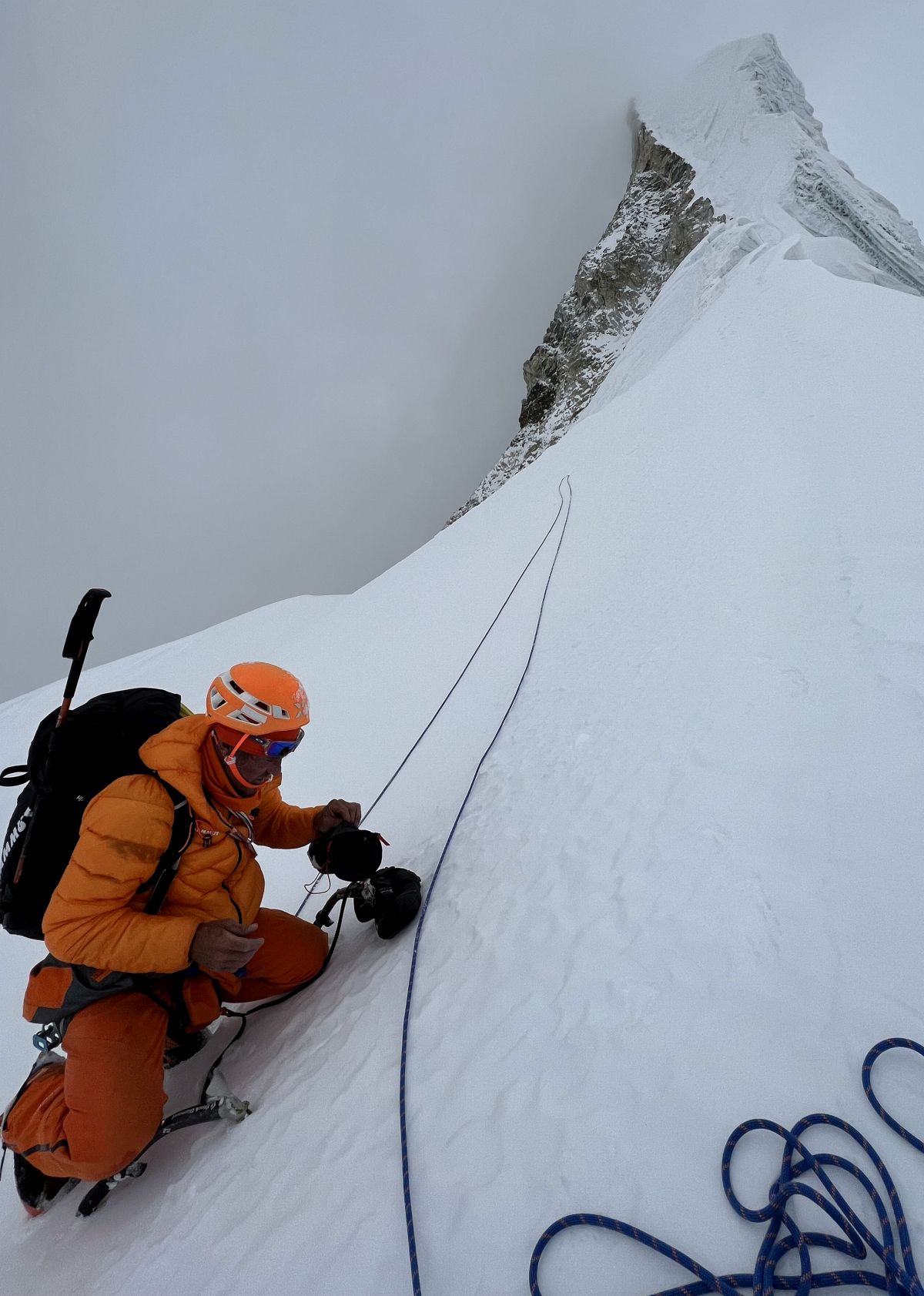 Sestup po hřebenu, který připomínal ostrý hřbet lochnesky, si vzal za své Matěj. Byl jsem tomu rád, jelikož vidíte před sebou ve sněhu stopy, které hlásí „prošel tady člověk a jde to“. Takový placebo efekt či spojení s životem. Je úplně jedno, že jsme s Matějem společně navázaní na lano v rozestupu dvaceti metrů. Pohybujeme se ve společném rytmu, kdy vzájemné jištění necháváme v rukou všemohoucího.  Na obě strany kilometrový padák a každý krok znamená zaseknutí cepínů i kopnutí maček. Jedno i druhé bylo pouhou hrou na jistotu. Ruce i nohy pokaždé trochu popojely, než našly stabilitu v sypkém sněhu. Hodiny ubíhaly a dno údolí se jen neochotně přibližovalo. Těsně před setměním se zbavujeme sněhového příkrovu. Naše nohy připomínající hadrovou panenku, nemotorně našlapují v kamenném moři. Každou chvílí se při došlapu uvolní hromada šutrů, která s rachotem proskotačí někam do přicházející tmy.