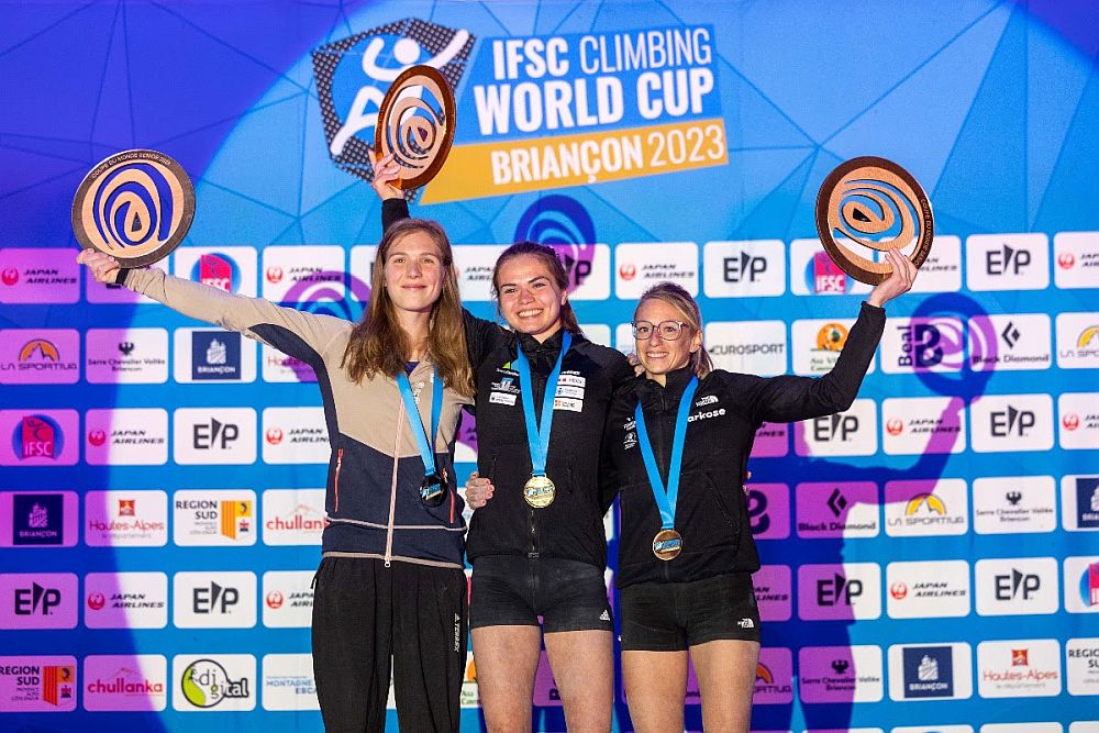 Eliška Adamovská na stupních vítězů, SP v lezení na obtížnost Briançon, Francie 2023 © Jan Virt/IFSC