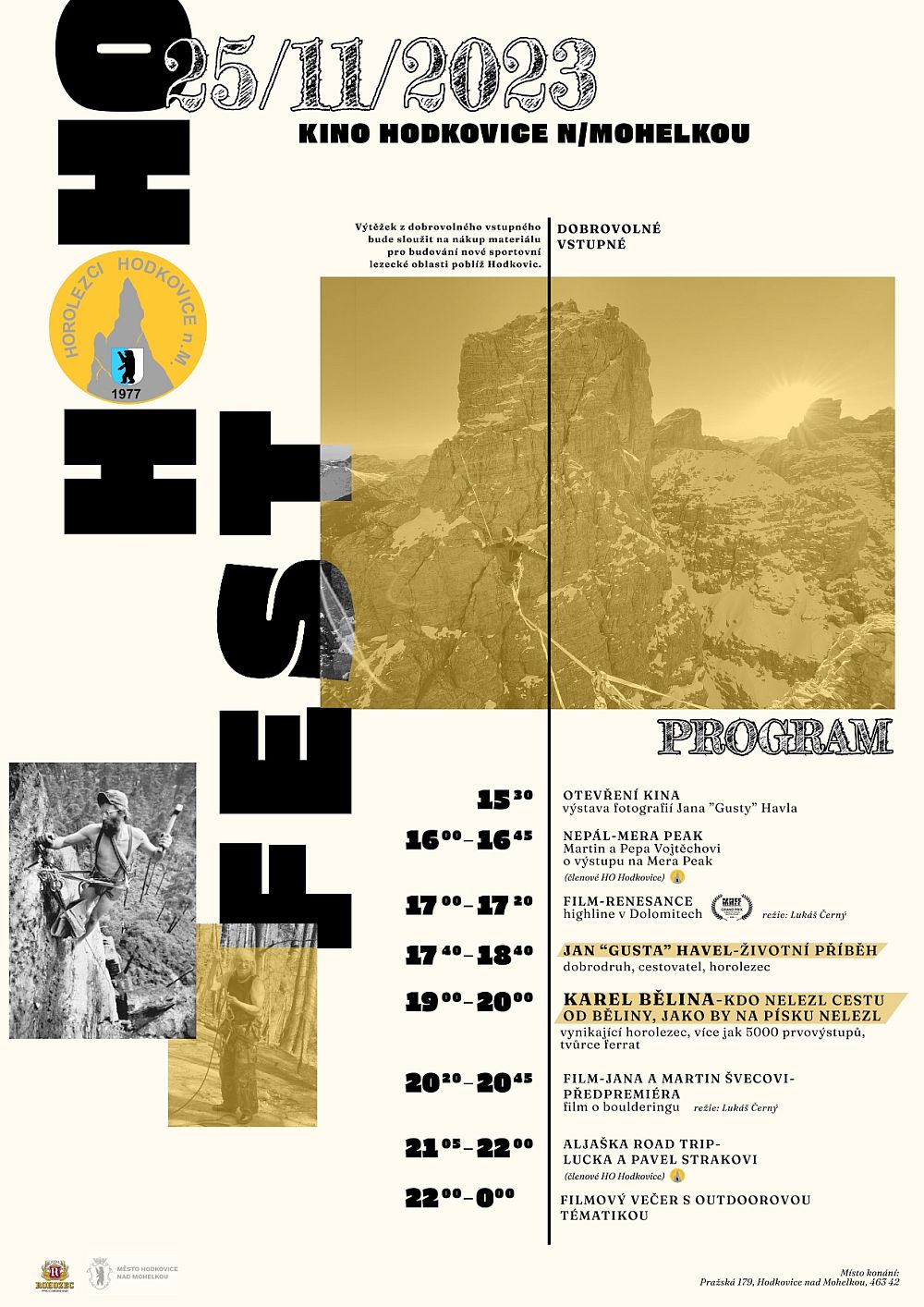 Samotní členové horolezeckého oddílu přijdou povyprávět o svých letošních počinech. Pepa a Martin Vojtěchovi se vydali do Nepálu na Mera Peak a Lucka a Pavel Strakovi se potulovali po divočině na Aljašce. Festival svým vyprávěním okoření hosté v podobě Jana "Gusty" Havla, který načrtne svůj životní příběh ve skalách. Legendární pískovcová fréza - Karel Bělina - přiveze řadu historek nejen o vytváření prvovýstupů. S Lukášem Černým se projdeme po highlině v Dolomitech a také nám promítne předpremiéru svého filmu o boulderingu Jany a Martina Švecových. Program bude doplněn různými filmy s outdoorovou tématikou až do půlnoci. Občerstvení zajištěno, těsíme se na vás.