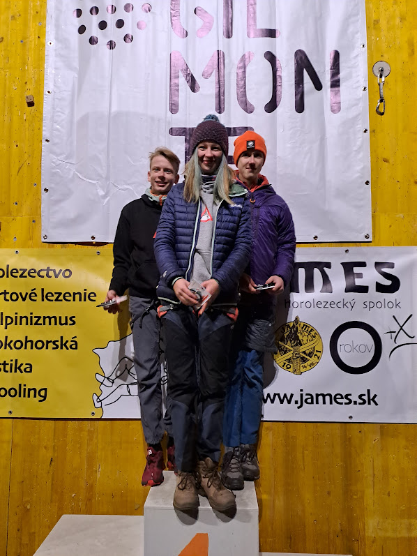 Finálovka byla laděná do celkem nezáludných, tradičně silovějších kroků a téměř celá z nových ocel/polyuretan TP chytů. Z českých závodníků šel na řadu první nejmladší Matyáš Lienerth (pro letošek ještě U16), velmi pěkné a plynulé lezení ukončilo chybné našlápnutí nohou a nezvládnuté přenesení plné váhy do tahového spoďáku. Hned po něm nastoupila Klára Pánková (pro letošek U21) a přes progres, který se v jejím lezení vyvíjel každou další cestou bylo vidět, že přednost měla v posledním měsíci škola a vylezenost nebyla ideální. Další z našich závodníků Oliver Hamerský (pro letošek ještě U19) vyřešil toto místo silovým, dlouhým tahem a spoďák vynechal, plynulé lezení zastavil až těsně pod topem časový limit. Podle časů, který závodníci trávili v cestě, bylo jasné, že na bednu bude nutný top a v co nejrychlejším čase. Jako první topoval cestu ze čtvrté pozice nastupující Radek Lienerth, a to se zbývající jednou vteřinou časového limitu. Jako poslední se z českých závodníků představila Tereza Sukačová. Velmi pěkný a plynulý postup zastavil až kamený chyt v půlce cesty, který se takticky rozhodla chybně nabrat v ne úplně ideální pozici a smekla. Tento výkon znamenal krásné druhé místo za Rebekou Gabčíkovou, které to prostě na domácí stěně v Žilině lezlo lépe