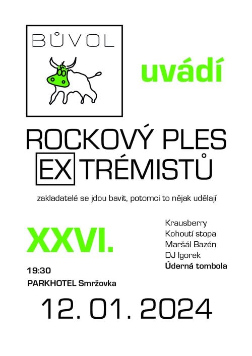 Srdečně vás zveme na XXVI. Rockový ples Ex-trémistů, který se uskuteční 12. 1. 2024 od 19.30 h, jako už tradičně v Parkhotelu Smržovka. Letos však přinášíme změnu - po 25 letech se zakladatelé rozhodli bavit a organizaci přebírají jejich potomci.