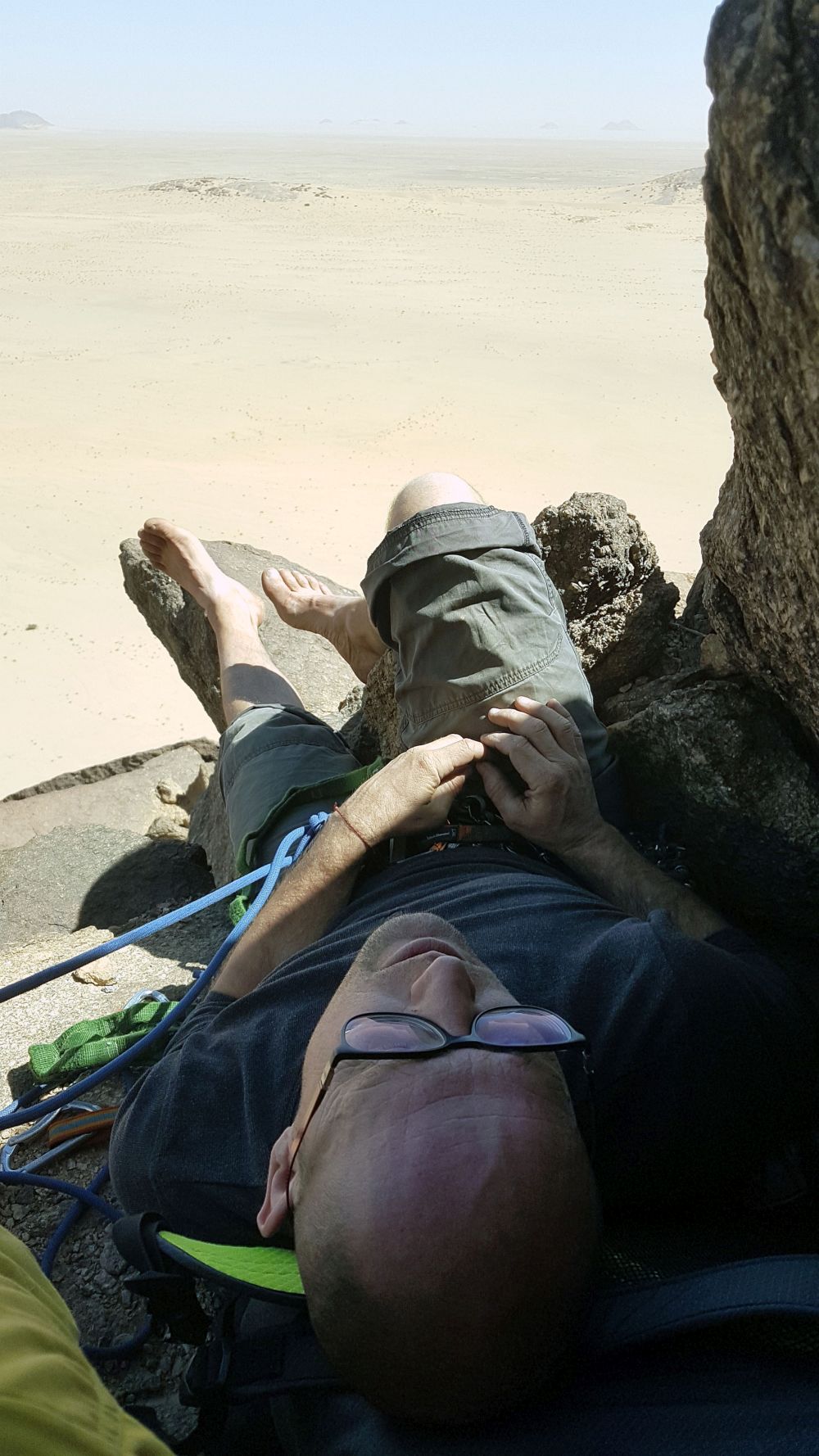 Večer přijíždíme k Ben Amera. Pokračujeme 3 km dále k dalšímu monolitu Ben Aicha 402 m.n.m. Na východní straně hory jsou stromy, kde rozbalíme tábor. Za svitu čelovek vycházíme k prvnímu nástupu. Od auta 20 minut chůze. Za východu slunce začínáme lézt cestu: Schouff la Fissure 300 m, D+, 6a. Všechny cesty jsou osazeny nýty 4-7 m od sebe. Krásné lezení v pevné žule. Za dvě hodiny jsme na vrcholu. Je devět hodin ráno. Sestup trvá další hodinu. Přes poledne lelkujeme, je vedro. Podle průvodce lze lézt další cestu od 13 hodin ve stínu. Čekáme do 16 hodin. Potom lezeme cestu: Même les chameaux meurent de soif D+ 350 m, 6a ( překlad: I velbloudi umírají žízní). Pěkná cesta začínající velikým koutem dlouhým 150 m. Po cestě zpět obcházíme celou horu a míjíme mrtvého velblouda, zřejmě již několik let. Už víme, kde vzali název cesty. Ben Aicha má zatím pouze 5 cest. Nejtěžší je: L’Origine du Monde, ED 350 m 7a. Nabízí veliký potenciál pro další těžké výstupy.