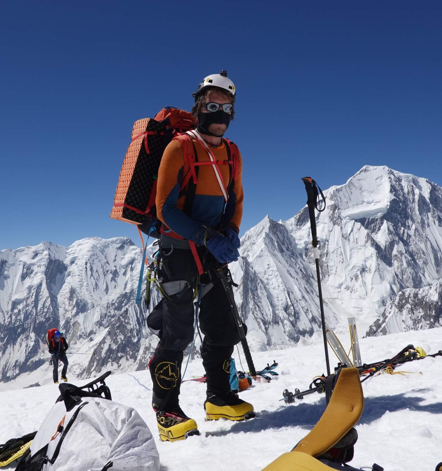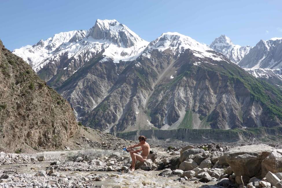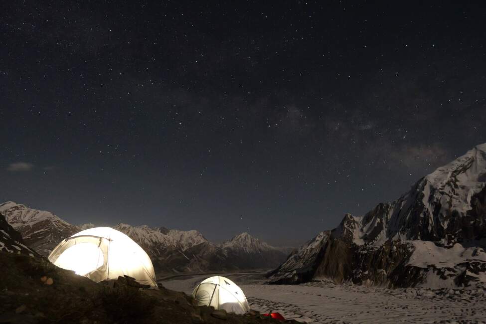 Základní tábor trůní na skalním ostrohu nad ledovcovým soutokem ve výšce 4300 m. Sněhové podmínky v Karákóramu se zejména v posledních letech těžko předjímají. Když jsme 20. června dorazili do základního tábora, ještě jeho výraznou část pokrýval sníh.