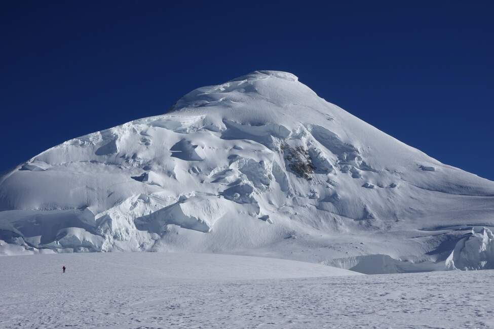 Terén nad bází se rychle zvedá, postup je nutné podřídit sněhovým podmínkám. My stoupali sérií zasněžených žlabů a skalních žeber vstříc hlavnímu hřebeni ve výšce zhruba 5000 m. Standardní výstupová trasa, dle mých dojmů vede více vpravo směrem na Arandu. I během této úvodní časti výstupu lze najit minimálně jednu plošinu vhodnou pro stan.
