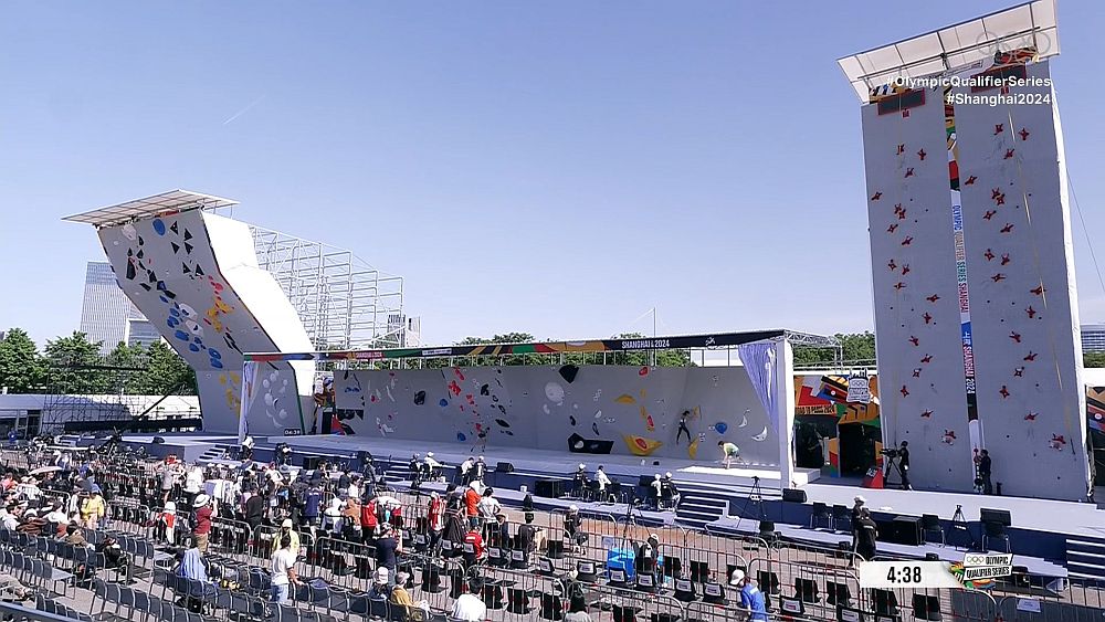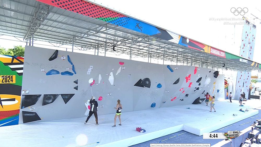 Záběr z přenosu kvalifikace v boulderingu na olympijské kvalifikaci v Šanghaji
