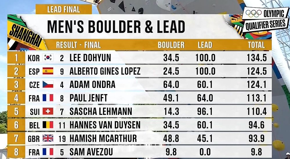 Ve finále v lezecké kombinaci na olympijské kvalifikaci v čínské Šanghaji skončil dnes Adam Ondra na 3. místě. Ve finálových bouldrech byl Adam 1., v obtížnosti 5. Závod vyhrál Korejec Dohyun Lee, druhý byl Španěl Alberto Ginés López.