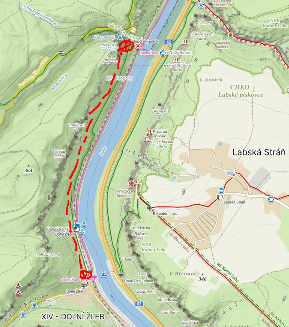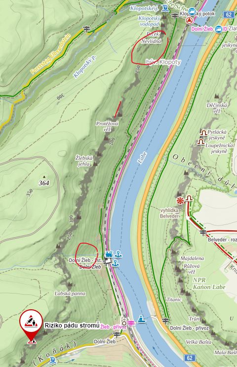 Z důvodu těžby kůrovcem napadeného lesa jsme nuceni dočasně uzavřít zelenou turistickou trasu v úseku od nádraží ČD Dolní Žleb - Klopotský potok. Skalní objekty v sektoru U hranic: Planeta země, Jednoruký bandita, Kasino, Mizantrop, Nevlídná věž, Prcek, Skrytá země, Hraniční jehla, Klopotská stěna do 30. 6. 2024