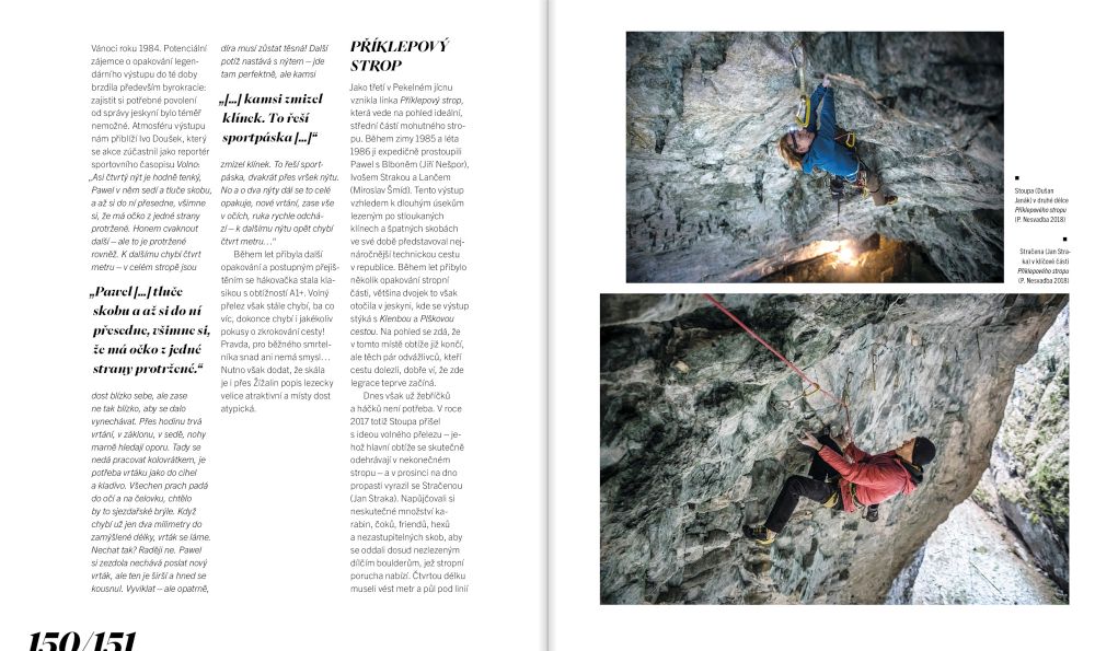 Neopomeneme také dodnes kultovní cesty, budící pro svou odvážnost respekt všech lezců: Znáš to, zlý sen – stojíš a držíš se čehosi v rozbité skále, přírodní kamenolom a shnilé dřevo v jednom. Poslední jištění je štand. Na co sáhneš, to upadne a s hororovým rachotem se roztříští dole v údolí… Jsem durch propocený, co minutu cítím, jak mi stékají pramínky horkého potu po spáncích přes krk hluboko na záda. Pocit, jako když teče teplá krev. Vlastně už chápu, proč se říká „potit krev“… Vše má ve své moci strach a hazard, dva nerozluční kumpáni. Krásné na těchto snech je jen probuzení, kdy pomalu přichází úleva a v jejích stopách opojné štěstí, že to byl jen sen. Jenže dnes to sen není…