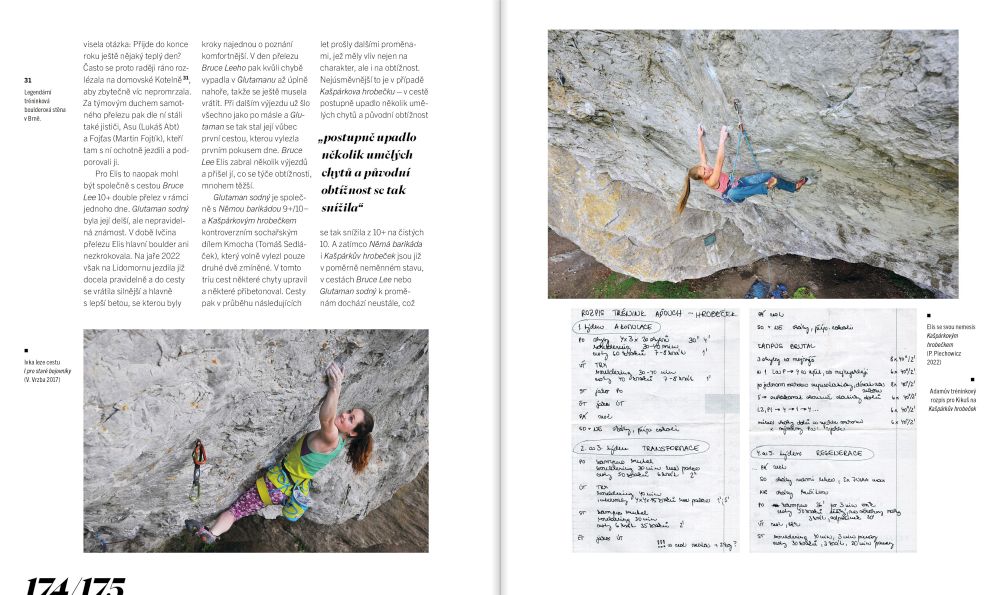 Prubířské kameny (rozuměj cesty) v naší knize opomenout také nelze. Především pro něžné pohlaví to je Kašpárkův hrobeček s doposud třemi přelezy: Do cesty Kikuš (Kristýna Eichmeirová) již několik let posílal Kala, její manžel, a nemálo lidí ji neustále hecovalo dotazy, zda už v Krase vylezla i něco „opravdu vážného“. Hrobeček tou dobou navíc neměl ani regulérní ženské opakování, což také působilo motivačně. „Člověk si tam nakonec docela dobře zaleze, i když ho zrovna nevyleze. Jsem ráda, že jsem se do něj pustila, i přesto, že jsem v něm strávila několik let. Hrob mě toho o lezení v převisech hodně naučil a v dalších cestách jsem z toho čerpala a dál čerpám,“ shrnuje Kikuš. Nutno dodat, že na tuto echt „chlapskou cestu“ brutálně trénovala...
