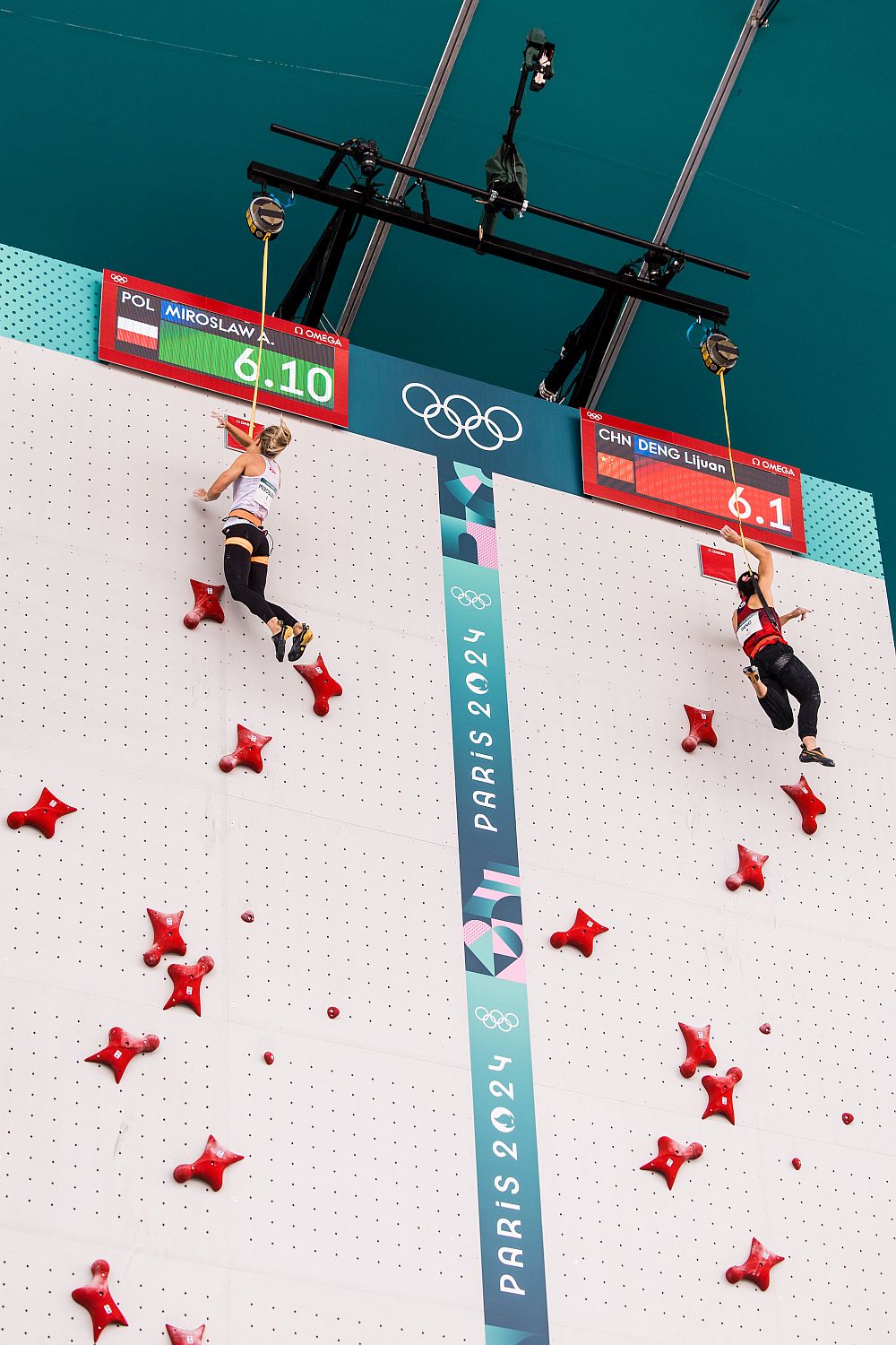 Zlato získala dnes v lezení na rychlost na olympiádě v Paříži Polka Aleksandra Miroslaw. Druhá byla Číňanka Deng Lijuan, třetí Polka Aleksandra Kalucka. Muži mají finále v rychlolezení zítra. Česko v této disciplíně zastoupení na olympiádě v Paříži nemá.