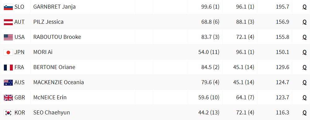 Po dnešním lezení na obtížnost úvodní části lezecké kombinace žen na olympiádě v Paříži je celkově nejlepší Slovinka Janja Garnbret. Dnes na laně obsadila sdílené 1. místo. Druhá je Rakušanka Jessica Pilz (dnes na laně 3.), třetí Američanka Brooke Raboutou (na laně 4.). Zde je seznam žen postupujících do sobotního finále lezecké kombinace: