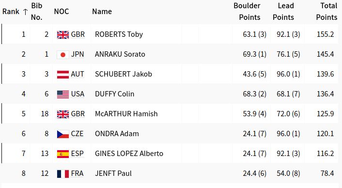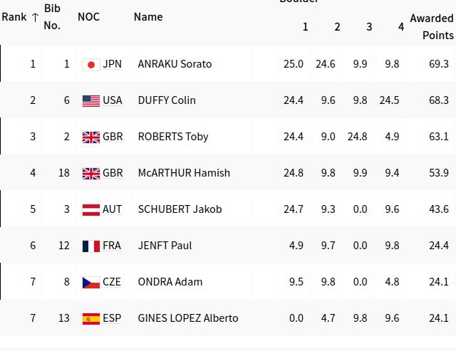 Výsledky bouldru podrobně na stránkách olympics.com: